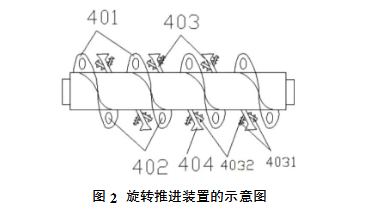 如圖1所示,本脈沖布袋除塵器用的二次除塵裝置,包括設(shè)置在脈沖布袋除塵器下箱體底部的導(dǎo)管2,還設(shè)有噴淋裝置3、旋轉(zhuǎn)推進裝置4和出漿管5,導(dǎo)管的出口端與旋轉(zhuǎn)推進裝置進料端連接,在導(dǎo)管與旋轉(zhuǎn)推進裝置的連接處還設(shè)置有噴淋裝置,噴淋裝置的噴水口穿過導(dǎo)管內(nèi)壁并朝向旋轉(zhuǎn)推進裝置的輸送料腔內(nèi),在旋轉(zhuǎn)推進裝置出料端連接出漿管;如圖2所示的旋轉(zhuǎn)推進裝置4包括輸送料筒、設(shè)置在輸送料筒內(nèi)的傳動軸以及帶動傳動軸旋轉(zhuǎn)的電機,在傳動軸上設(shè)有帶漏料孔402的螺旋葉片401,螺旋葉片之間還設(shè)置有攪拌棒403,攪拌棒403一端與傳動軸固定連接,另一端設(shè)置清除輸送料筒內(nèi)壁灰塵的刮刀404;所述的噴淋裝置上還設(shè)有進水開關(guān);所述的旋轉(zhuǎn)推進裝置出料端設(shè)置有噴淋裝置;所述的傳動軸兩側(cè)均設(shè)置攪拌棒403,且刮刀404與攪拌棒403之間的角度為75-135°。